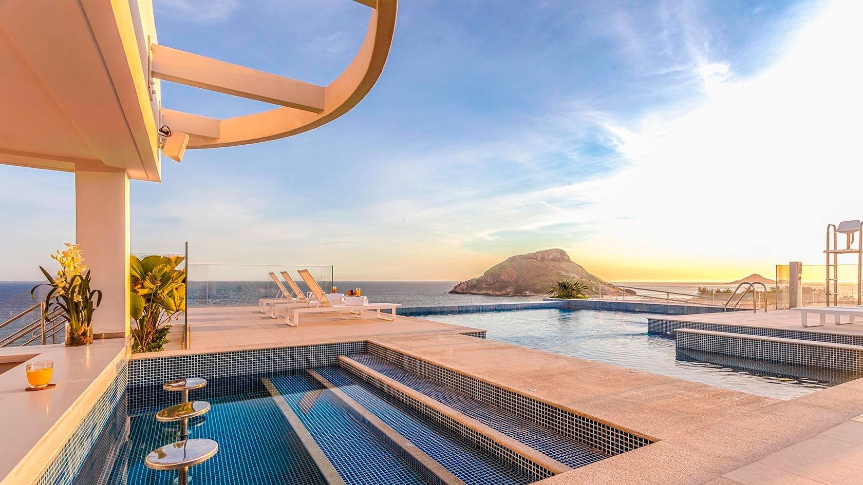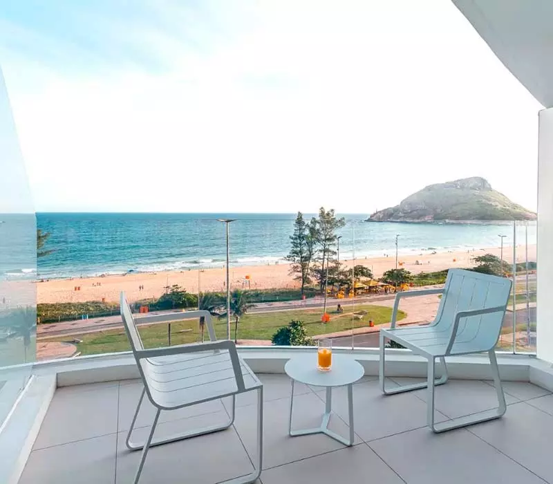 O destaque fica com a luxuosa Suíte Júnior, uma cobertura com cama king size, espreguiçadeiras e belíssima vista da praia do Recreio dos Bandeirantes.